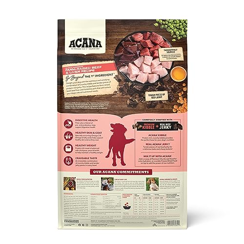 Bring home the quality nutrition your dog needs to thrive with ACANA Butcher’s Favorites Farm-Raised Beef & Liver Recipe Dry Dog Food. This high protein dog food includes premium ACANA dog food kibble and tender pieces of protein-rich real beef jerky your dog will crave. Fresh farm-raised beef, beef liver and Yorkshire pork are balanced with chickpeas, peas & lentils to help maintain a healthy weight. The dry dog food is 70 percent* animal ingredients and 30 percent** plant ingredients and nutrients. Even better, nutritious ingredients in this ACANA dog food kibble help support three key health benefits, including digestive health, a healthy weight and a healthy skin and coat. Our included fresh ingredients use refrigeration as the sole method of preservation and our included raw ingredients are frozen at their peak freshness. Choose ACANA dry dog food to give your companion the nutritional foundation they need to live a happy, healthy life. *Approximate and derived from the unprocessed state of the ingredients **We also add vitamins, minerals, natural preservatives flavors and probiotics
