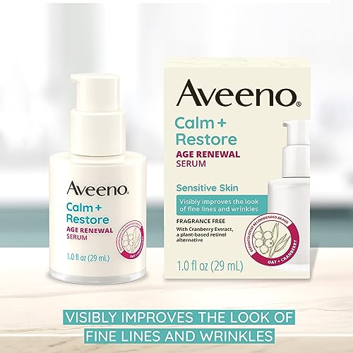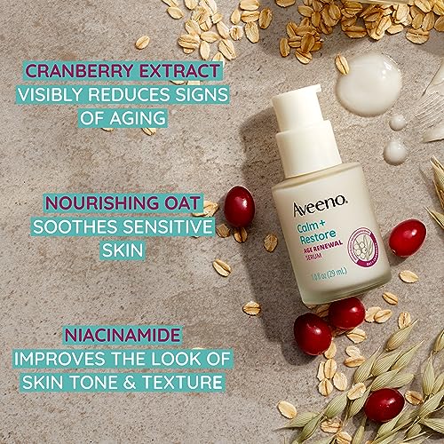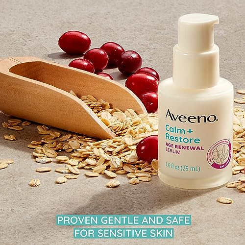 1-fluid ounce bottle of Aveeno Calm + Restore Age Renewal Face serum, anti-aging serum for sensitive skin with nourishing oat & cranberry extract to visibly improve the look of fine lines & wrinkles
