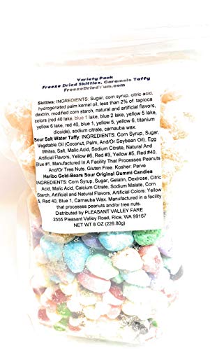 OUR FLAVORS: Freeze dried Werther’s soft chew caramels, original Skittles, and original taffy. Freeze drying removes the moisture and leaves the flavor. The caramels themselves are delicious. But the taffy is amazing. But we can’t forget about the Skittles. This variety pack is great so you can try three of the most popular freeze dried candies all at the same time.